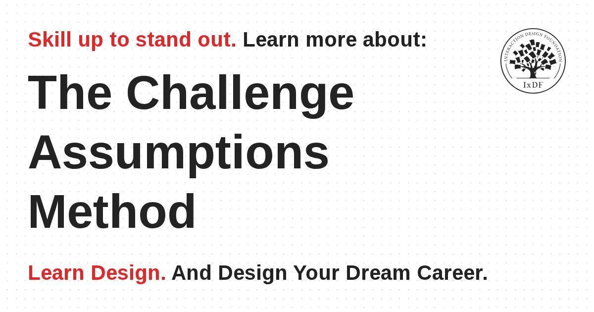 “Challenge assumptions” is an ideation method that helps UX (user experience) design teams break free from conventional thinking and push past false beliefs. You use it to identify and question the assumptions your design decisions rest on, then flip or remove them to uncover fresh solutions. It’s a powerful way to spark innovation and shift how you see a problem.